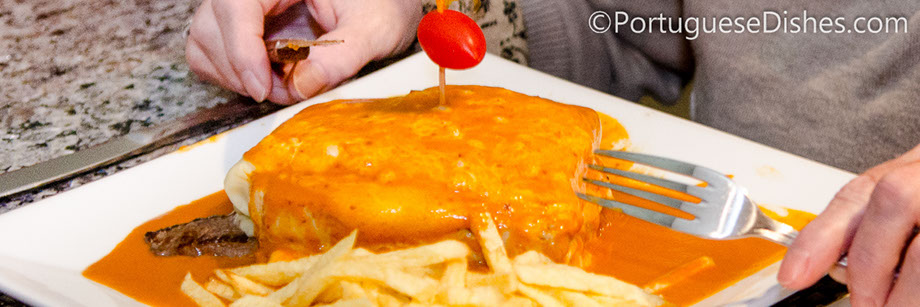 The name "francesinha" means little frenchie. Francesinhas are a Portuguese sandwich originally from Porto, A francesinha is usually made with bread, ham, linguiça, steak or roast meat, covered with melted cheese and then topped with a spicy tomato sauce and accompanied with french fries. The sauce is usually well kept secret by each cook, with each cook having his/her own variation.