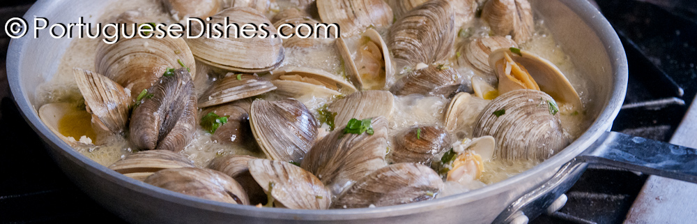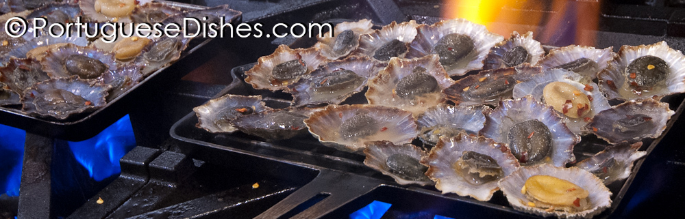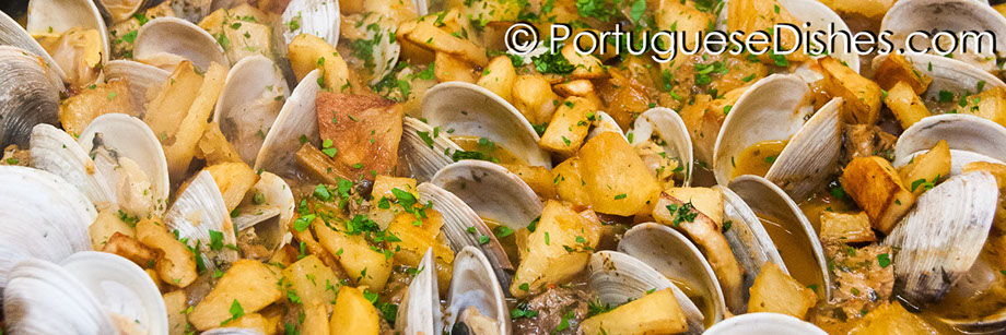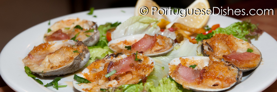 Açorda de marisco, Açordas e migas, Ameijoas á Bulhão Pato (Littlenecks poached in a garlic, olive oil and white winebroth), Amêijoas na cataplana, Arroz de Lapas, Arroz de Marisco (Seafood risotto with mussels, clams, squid & lobster), Arroz de Mariscos a Valenciana (Shrimp mussels, clams, squid, pork, linguica and chicken cooked with saffron rice),Azas de galinha (Buffalo wings), Bacalhau à Brás, Bacalhau à Gomes de Sá, Bacalhau à lagareiro, Bacalhau à minhota, Bacalhau de Cebolada, Bacalhau à Zé do Pipo, Bacalhau assado com batatas a murro, Bife a Casa, Bife com ovo a cavalo, Bife de atum, Bifes de cebolada, Bife São Miguel, Bola de bacalhau, Bola de Berlim, Cabrito assado no forno, Caldeirada de Bacalhau (Traditional dry salt codfish stew), Caldeirada de peixe, Caldo Verde, Camarão São Miguel, Camarão com Queijo de Cabra, Canja, Carne de porco à alentejana, Cataplana de marisco, Coelho à caçadora, Cozido à portuguesa, Empadão de carne a moda da casa, Favas guisadas, Feijoada de Mariscos, Feijoada à transmontana, Favas com Linguica, Francesinhas, Galinha Alentejana, Galinha Vinho da Madeira, Galinha Vinho de Porto, Leitão assado, Linguica a Bombeiro (Flamed linguiça), Lulas á Alho (sautéed squid with garlic), Mexilhoes de cebolada, Migas, Migas de caldeirada de bacalhau, Pão-de-ló, Pargo no forno, Pasteis de Bacalhau (codfish cakes), Pastel de nata, Polvo assado, Polvo à lagareiro, Portuguese Sandwiches, Queijadas da Madeira, Rissóis, Salada da Horta (Garden Salad), Salada de Polvo, Salada de Bacalhau, Salada de Polvo, Salgados, Sardinas grelhadas à portuguesa, Tripas à moda do Porto ...